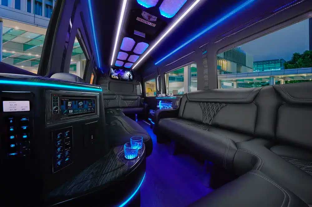 You and your guests step into a gleaming Mercedes Sprinter or executive party bus, greeted by the soft glow of LED lighting and the hum of your favorite playlist streaming through premium Bluetooth sound.